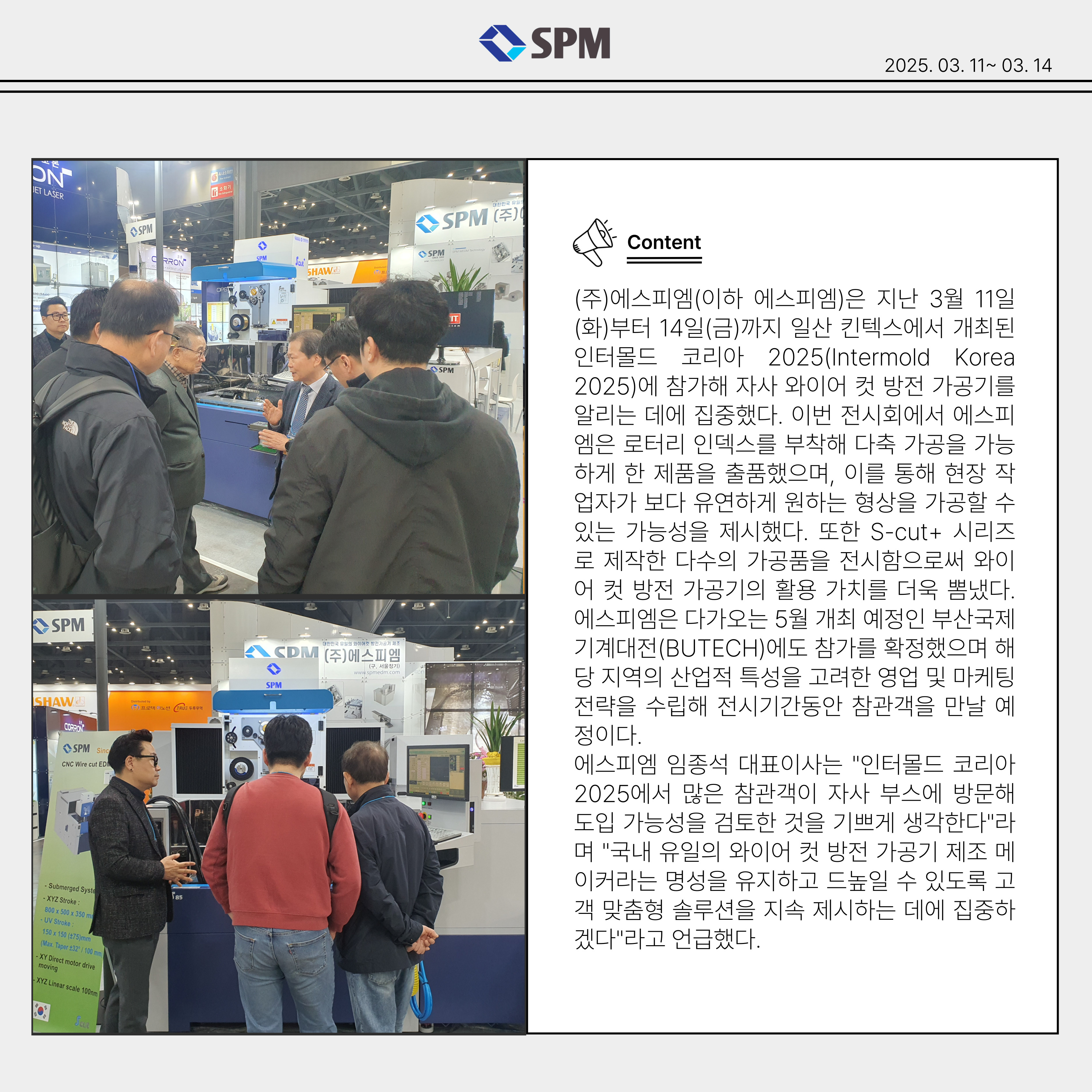 (ÁÖ)¿¡½ºÇÇ¿¥(ÀÌÇÏ ¿¡½ºÇÇ¿¥)Àº Áö³ 3¿ù 11ÀÏ(È)ºÎÅÍ 14ÀÏ(±Ý)±îÁö ÀÏ»ê ŲŨ½º¿¡¼ °³ÃÖµÈ ÀÎÅ͸ôµå ÄÚ¸®¾Æ 2025(Intermold Korea 2025)¿¡ Âü°¡ÇØ ÀÚ»ç ¿ÍÀ̾î ÄÆ ¹æÀü °¡°ø±â¸¦ ¾Ë¸®´Â µ¥¿¡ ÁýÁßÇß´Ù. À̹ø Àü½Ãȸ¿¡¼ ¿¡½ºÇÇ¿¥Àº ·ÎÅ͸® À妽º¸¦ ºÎÂøÇØ ´ÙÃà °¡°øÀ» °¡´ÉÇÏ°Ô ÇÑ Á¦Ç°À» ÃâǰÇßÀ¸¸ç, À̸¦ ÅëÇØ ÇöÀå ÀÛ¾÷ÀÚ°¡ º¸´Ù À¯¿¬ÇÏ°Ô ¿øÇÏ´Â Çü»óÀ» °¡°øÇÒ ¼ö ÀÖ´Â °¡´É¼ºÀ» Á¦½ÃÇß´Ù. ¶ÇÇÑ S-cut+ ½Ã¸®Áî·Î Á¦ÀÛÇÑ ´Ù¼öÀÇ °¡°øÇ°À» Àü½ÃÇÔÀ¸·Î½á ¿ÍÀ̾î ÄÆ ¹æÀü °¡°ø±âÀÇ È°¿ë °¡Ä¡¸¦ ´õ¿í »Ë³Â´Ù.