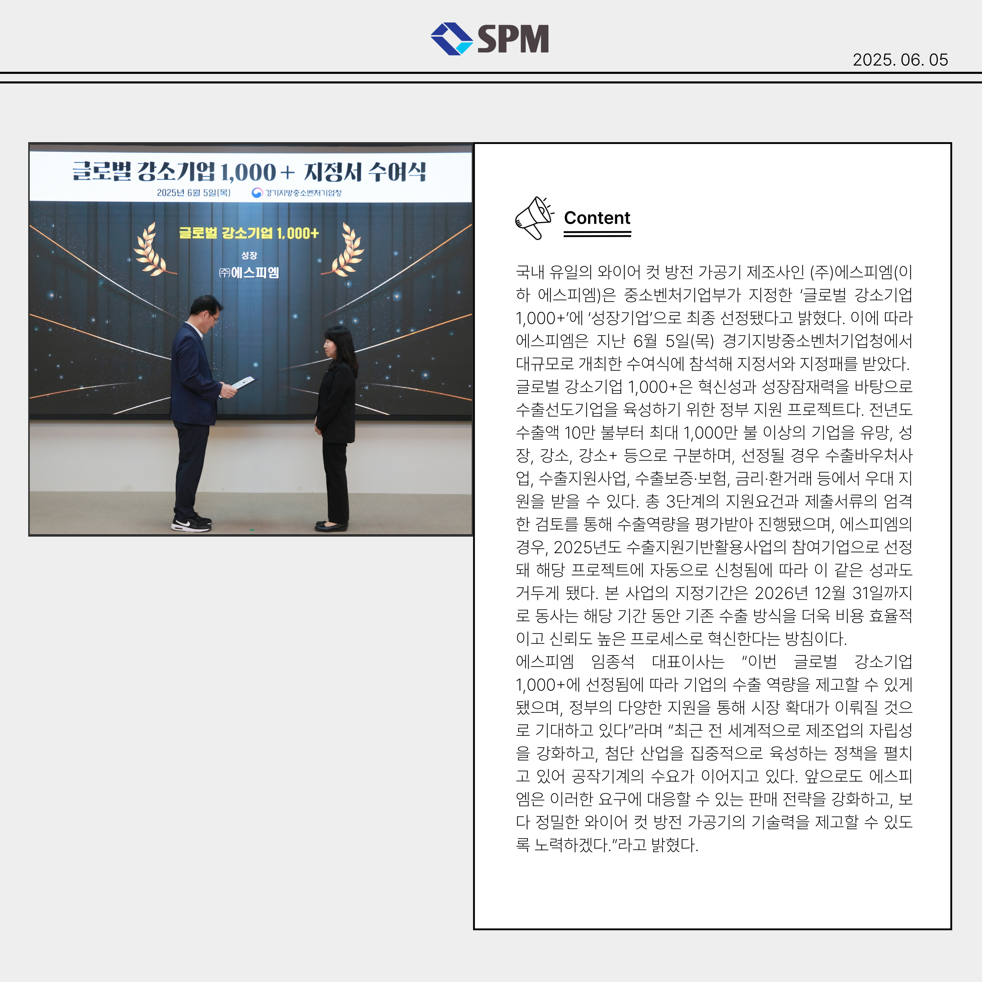 ±¹³» À¯ÀÏÀÇ ¿ÍÀ̾î ÄÆ ¹æÀü °¡°ø±â Á¦Á¶»çÀÎ (ÁÖ)¿¡½ºÇÇ¿¥(ÀÌÇÏ ¿¡½ºÇÇ¿¥)Àº Áß¼Òº¥Ã³±â¾÷ºÎ°¡ ÁöÁ¤ÇÑ ¡®±Û·Î¹ú °¼Ò±â¾÷ 1,000+¡¯¿¡ ¡®¼ºÀå±â¾÷¡¯À¸·Î ÃÖÁ¾ ¼±Á¤µÆ´Ù°í ¹àÇû´Ù. ÀÌ¿¡ µû¶ó ¿¡½ºÇÇ¿¥Àº Áö³ 6¿ù 5ÀÏ(¸ñ) °æ±âÁö¹æÁß¼Òº¥Ã³±â¾÷û¿¡¼ ´ë±Ô¸ð·Î °³ÃÖÇÑ ¼ö¿©½Ä¿¡ Âü¼®ÇØ ÁöÁ¤¼¿Í ÁöÁ¤ÆÐ¸¦ ¹Þ¾Ò´Ù.