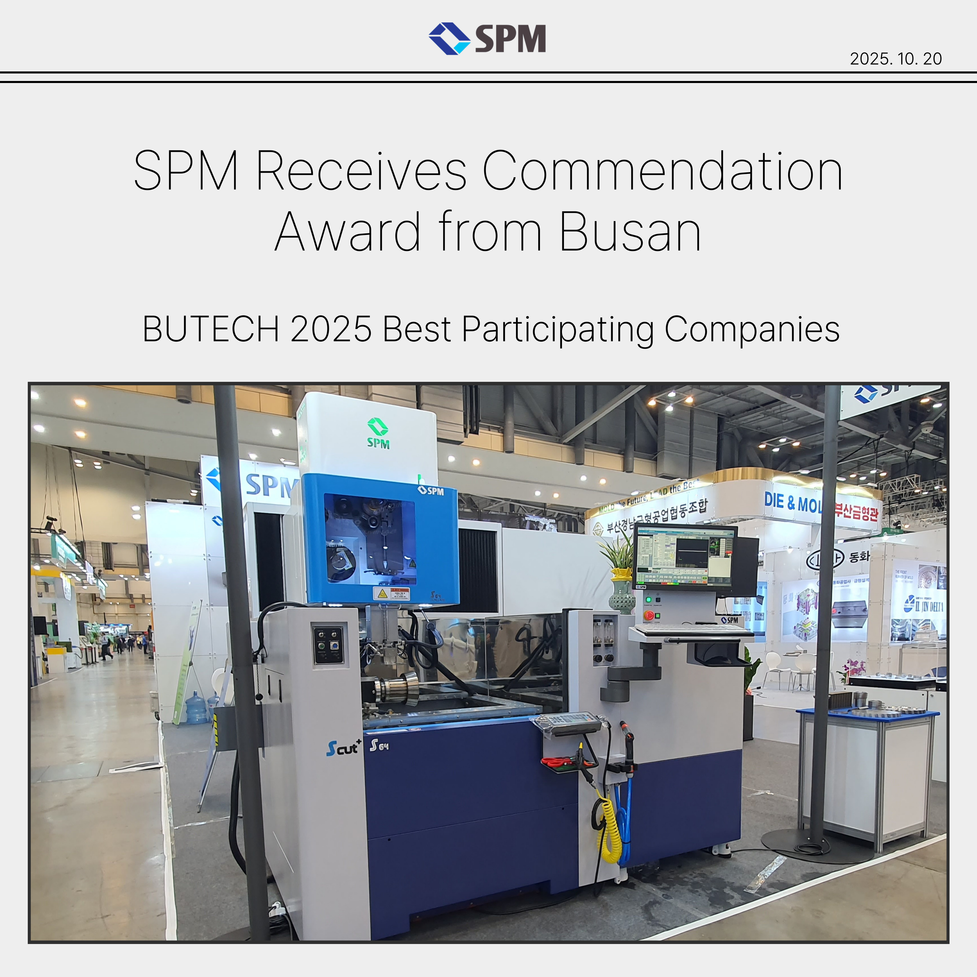 SPM Co., Ltd., the only domestic manufacturer of wire-cut EDM machines, was selected as an Outstanding Exhibitor and received a commendation from the City of Busan for its participation in the 2025 Bu..